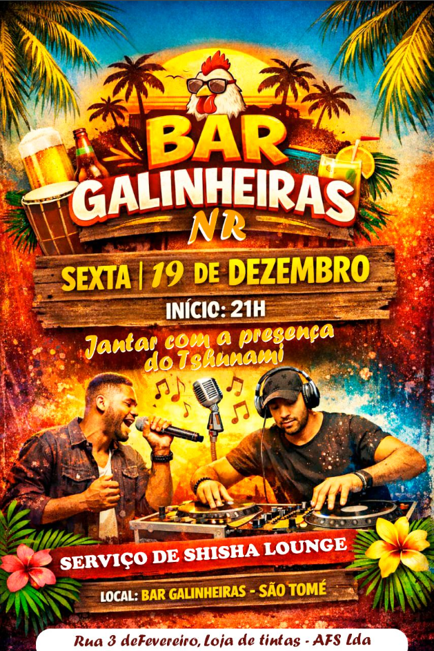 Jantar e noite de entretenimento no Bar Galinheiras NR com a presença do artista do momento Tshunami. O evento inclui serviço de Shisha Lounge e animação musical com DJ e cantor ao vivo.