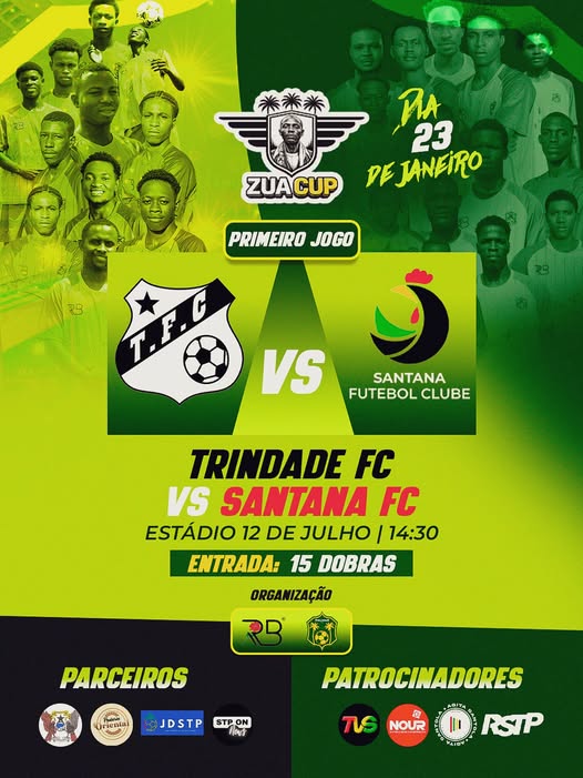 Grande confronto entre o Trindade FC e o Santana FC, a realizar-se no dia 23 de Janeiro no Estádio 12 de Julho. O evento faz parte da ZUACUP 2026 e conta com diversos parceiros e patrocinadores, incluindo a TVS, RSTP e Nour.
