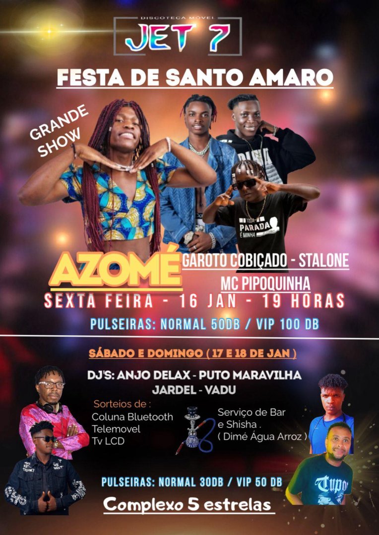 Prepare-se para um fim de semana inesquecível na Festa de Santo Amaro com a Discoteca Móvel JET 7! A celebração começa em grande na sexta-feira, dia 16 de janeiro, a partir das 19h00, com um espetáculo imperdível de Azomé, Garoto Cobiçado, Stalone e MC Pipoquinha. A festa continua no sábado e domingo, dias 17 e 18 de janeiro, ao som dos DJs Anjo Delax, Puto Maravilha, Jardel e Vadu. Além da melhor música, teremos sorteios de colunas Bluetooth, telemóveis e TVs LCD para os presentes. O local conta com serviço de bar e shisha pela Dimé Água Arroz. Para sexta-feira, as pulseiras custam 50 DB (Normal) e 100 DB (VIP). No fim de semana, os valores são 30 DB (Normal) e 50 DB (VIP). Venha celebrar connosco no Complexo 5 Estrelas!