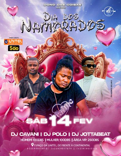 Celebração romântica do Dia dos Namorados organizada pela "Dono das Coisas" no Espaço da Unitel. O evento conta com performances de três DJs e oferece diferentes áreas de acesso, incluindo uma zona VIP exclusiva.